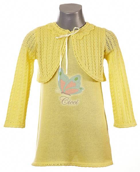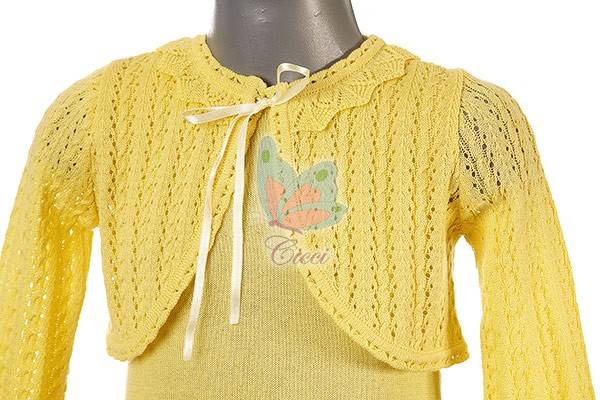 tinuta pentru ocazii speciale, deux-piece compus din rochita simpla fara maneci si bolerou ajourat complet, cu maneca lunga, inchidere cu snur satinat, guleras cu coltisori dantelati , din tricot, aplicati cu o cusatura fina aspect usor stralucitor al tricotului conferit de structura usoara, vaporoasa le va face pe fetite sa se simta mici zane