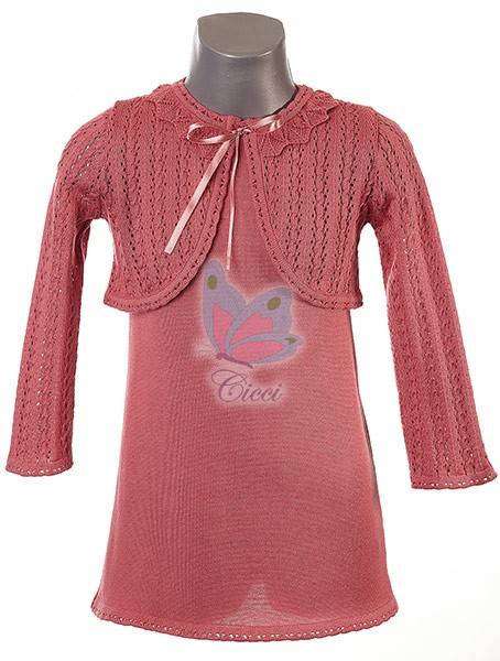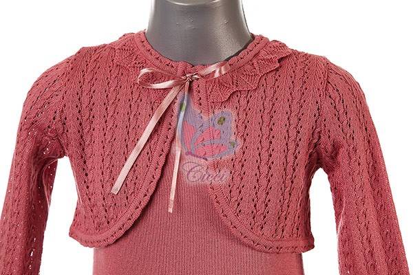 tinuta pentru ocazii speciale, deux-piece compus din rochita simpla fara maneci si bolerou ajourat complet, cu maneca lunga, inchidere cu snur satinat, guleras cu coltisori dantelati , din tricot, aplicati cu o cusatura fina aspect usor stralucitor al tricotului conferit de structura usoara, vaporoasa le va face pe fetite sa se simta mici zane
