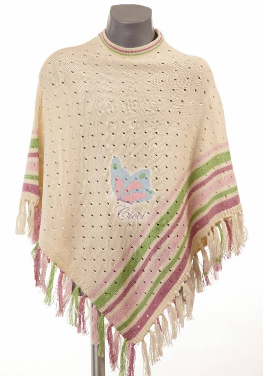 poncho cu gaurele si joc de dungi in diagonala, franjuri jucausi multicolori se potriveste si la pantaloni si peste o rochita; produs de vestimentatie practic si elegant,