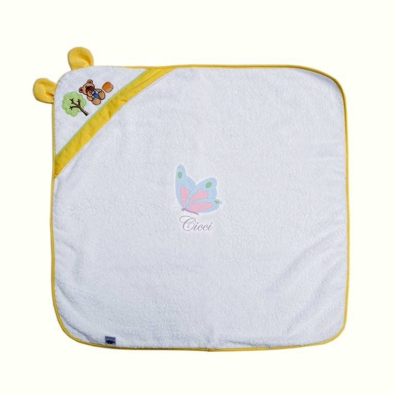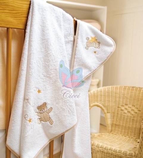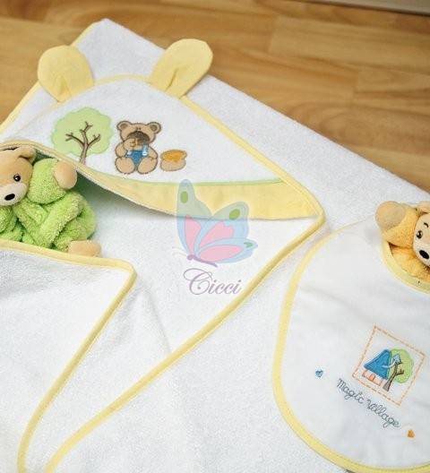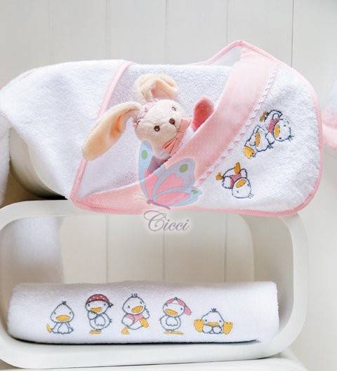 un prosop dragut destinat bebelusilor fetite sau baietei, din 100% bumbac, cu gluga cu urechiuse si broderii diferite, in functie de modelul caruia apartine