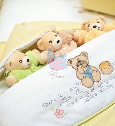 fata, din bumbac galben,are o bordura alba, brodata cu un ursulet si text,interiorul din bumbac alb.
